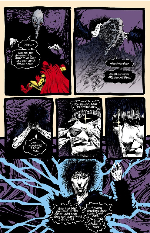 Sandman, cuya verdadera identidad es Hector Hall se enfrenta a Morfeo, pero sus ataques no surten efecto en el Eterno, quien al enterarse de quien dice ser Hector se larga a reír sin parar y decide acabar con todo inmediatamente sacando a todos de la cabeza de Jed, quien huye despavorido al ver lo sucedido.