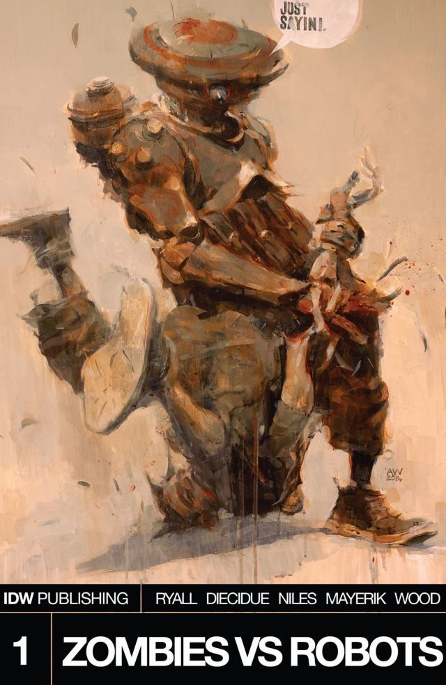 Por un lado, mi lado más serio me dice que no debería perder el tiempo hablando de esto, pero mi lado niño grita, “OMG, ROBOTS VS ZOMBIES”. Sí, suena divertido, pero para ser el concepto de un cómic que pudo salir de la cabeza de un infante de cinco años dibujando un Jaeger sacándole la cabeza al conejo gigante de Resident Evil en clases de arte de Kindergarden mientras sus compañeros se comen la tempera, Zombie vs Robots es innecesariamente complicado. Tanto en dibujo como en el guión. Implica viajes en el tiempo, muchos diálogos robotizados científicos que no logré descifrar del todo, y flashbacks.