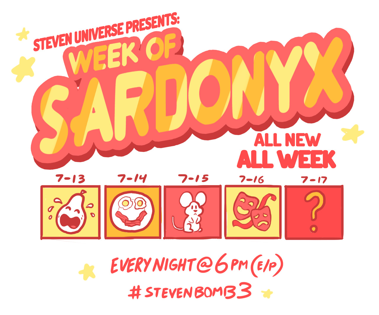 Sardonyx: La mujer gigante, graciosa y perspicaz, nace del resultado entre Pearl y Garnet. Al decidir que deben destruir la antena que permite la comunicación entre los mundos de las gemas, Garnet toma la decisión de fusionarse con Pearl, ya que Sardonyx es menos impulsiva e inteligente que Sugalite (la fusión entre Garnet y Amatista). Sardonyx adquiere un diseño que imita a un mago.