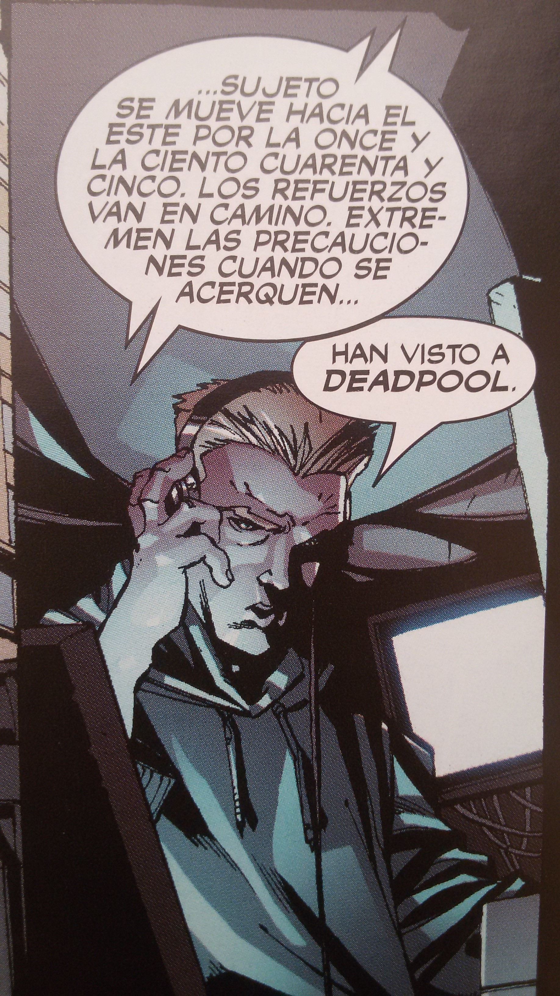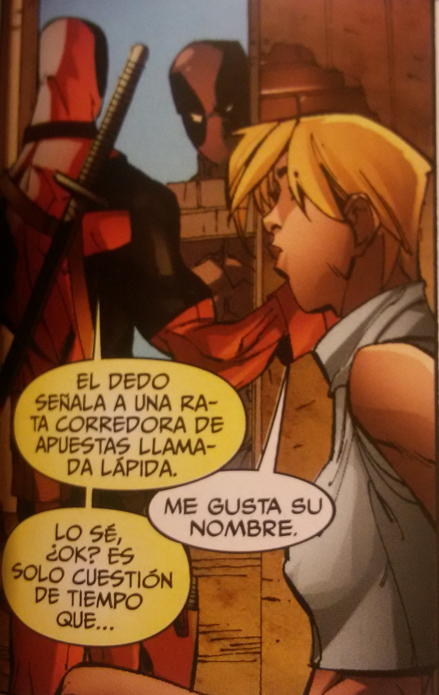 Otro ejemplo, una de las voces de Deadpool usa la palabra pandering en el comic, pero como verbo, no como sustantivo. Fuera de broma, pareciera que para las bromas difíciles de entender y traducir ocuparan Google Translate. Literalmente. Proxenetismo es una traducción demasiado literal, bastante cruda y básica, ya que no tiene otras interpretaciones, pero supongo que no encontraron una mejor idea para escribir en el espacio de una sola palabra. Conocemos al mercenario, y aunque tenga deseos carnales como todos, dudo que se convierta en algun tipo de proxeneta, en ese sentido, tiene principios morales bastante altos (sin contar los asesinatos, claro está). En ese momento, Deadpool estaba sacando beneficio a costa de la situación en la que estaba metido, se refería a que tenía que dejar de venderse, y mirar donde estaba parado.