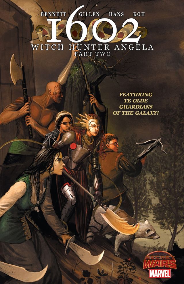 1602 es otro de los mundos que componen el Battleworld, este en particular fue creado en el 2003 por Neil Gaiman (otrora autor de The Sandman), en el cual existen todos nuestros héroes en un ambiente “medieval”, con Reyes y Lords, Tabernas y Caballeros, Nacidos-brujos (mutantes) y Sir Nicholas Furia, espía personal de la Reina Isabel I. Además, la protagonista de esta serie en particular es Angela, personaje inventado por el mismo Gaiman para la serie Spawn de Image Comics y que recientemente pasó a engrosar las filas de la Casa de las Ideas.