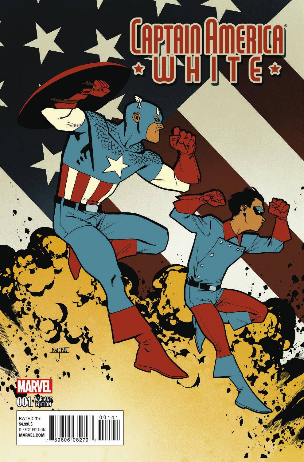 Tavo: Rogers y Barnes son los protagonistas de este cover cargado de acción y patriotismo. Loeb y Sale vienen a complementar la Colección de Colores de los grandes héroes de la Marvel, sumando este White al Grey de Hulk, el Yellow de Daredevil y el Blue de Spider-Man. La portada refleja la nostalgia de los inicios del Capi, cuando los poderes eran escasos. El dibujo es totalmente limpio y la sombra se maneja sólo con el entintado por lo que el minimalismo predomina en una imagen llena de dinamismo.