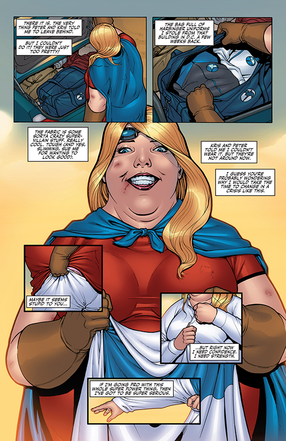 Así, la estructura de este arco dedica un número a la presentación o profundización de cada personaje, permitiéndonos conocer más sobre Peter (Sting), Faith (Zephyr) y Kris, a la vez que nos presentan a Charlene (Flamingo) y John (Torque). El trabajo de Dysart en este aspecto es muy bueno, dejándonos rápidamente claro las claves que definen a cada uno; la limitación física de Torque, la vida subyugada de Flamingo, la búsqueda de significado de Zephyr, el impulso de Kris y el eterno camino de redención de Peter. Cada número aporta una nueva capa a los personajes y los acerca al lector de forma muy real. Durante estos números también nos reencontramos brevemente con Livewire, quien se convertirá en un personaje clave en el panorama editorial más adelante. Su aparición es breve, pero augura cosas mayores para ella.