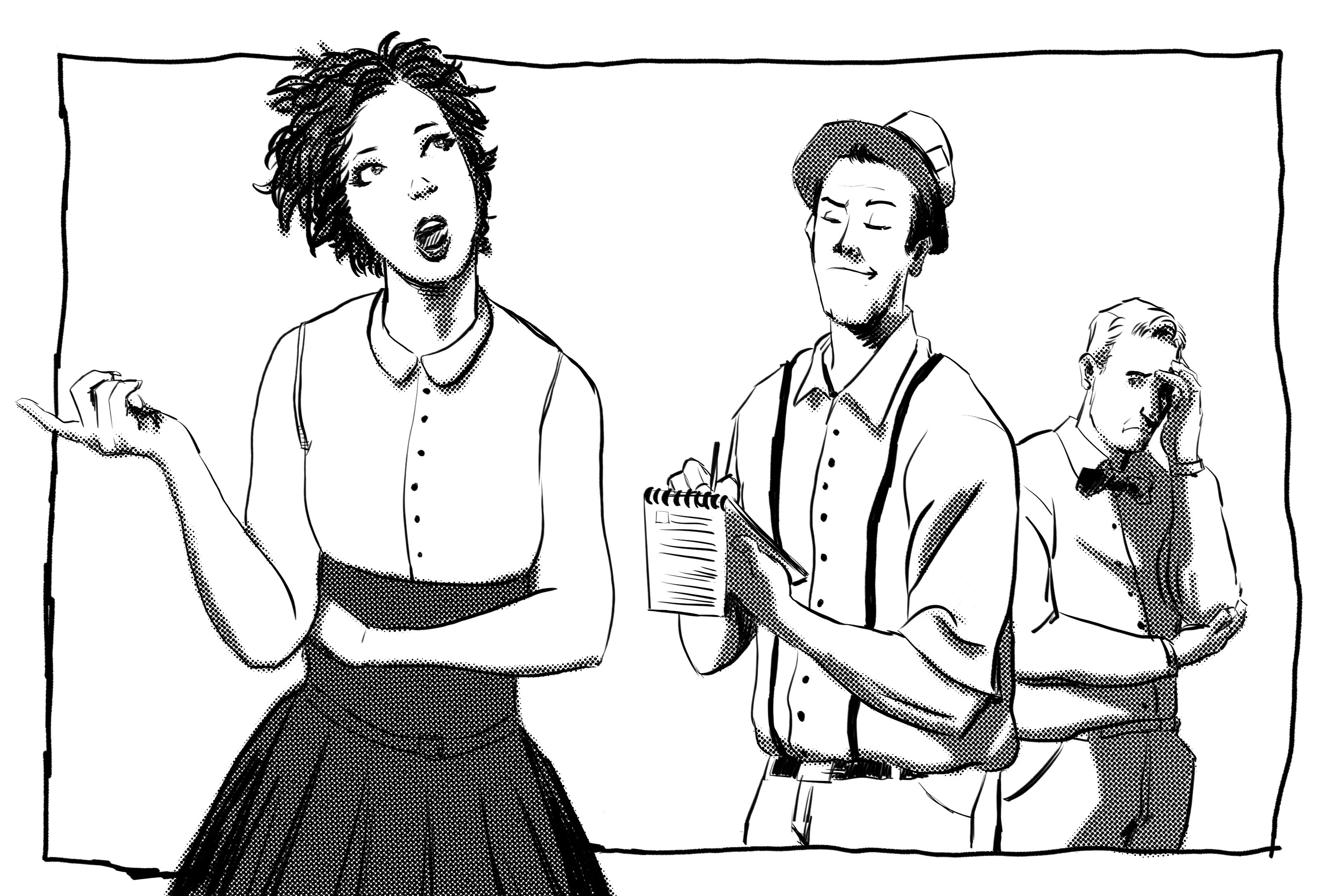 Marston comienza a escribir en su libreta mientras las dos mujeres hablan sobre el nuevo personaje.