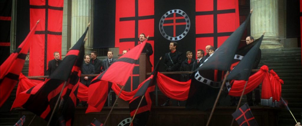 El film tiene muchas cosas que funcionan al final. Escenas que se llenan de poder y se enaltecen a cada momento y se cuadran con el mensaje central. Secuencias como el discurso de V ante el pueblo de Inglaterra que está filmada de puta madre, donde las miradas de los ciudadanos se cruzan a medida que las palabras del revolucionario personaje empiezan a soltar verdades tan grandes como una casa. O la secuencia de los dominós donde se puede ver —gracias a pequeñas escenas insertas— cómo el pueblo se empieza a cuadrar con la visión de V; cómo está tan bien colocado ese Anarchy in the UK seguido por un balazo, perpetrado por un ladrón con la máscara de Guy Fawkes. Cómo el caos comienza a apoderarse de Londres a medida que las piezas caen, y al final, hay una pieza que no sigue el patrón. La misma pieza que le dejan como recuerdo a Evey al final.