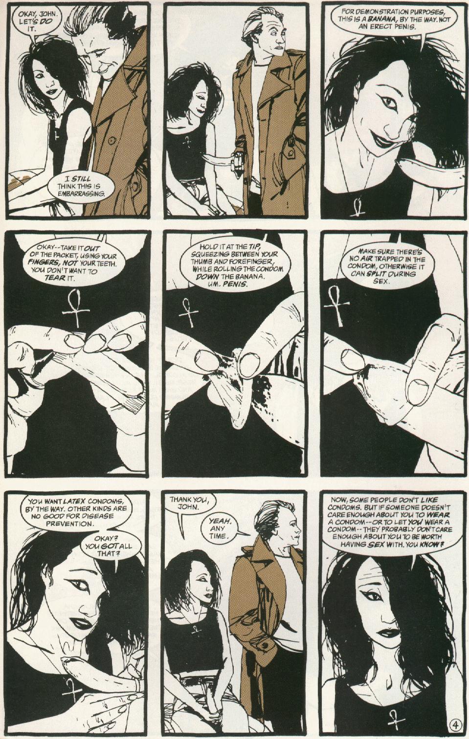 Finalmente, y como un voluntario bastante obligado, John Constantine se une a la escena para la demostración de cómo poner un condón correctamente. La camadería entre los personajes se siente en el aire y con una entereza bastante traviesa, hace una demostración clara y simple del uso del condón. Gaiman brilla, procurando que el lector se entretenga con la picardía del personaje, la situación en la que pone a Constantine y la seriedad que tiene para entregar la información vital.