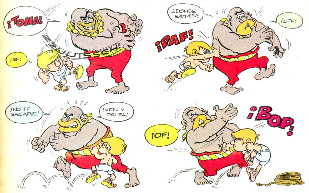 En estas siguientes 4 páginas seguimos en el espacio, pero desde aquí la narración toma un ritmo más acelerado. Ahora son los personajes, hablando consigo mismos o con otros, los que explican lo que sucede, en lugar de depende de cuadros narrativos. Los dibujos se vuelven más expresivos y las palabras se reducen para dar espacio a la acción. Al final de estas cuatro páginas, finalmente llegamos al destino de esta aventura: la antigua Roma.
