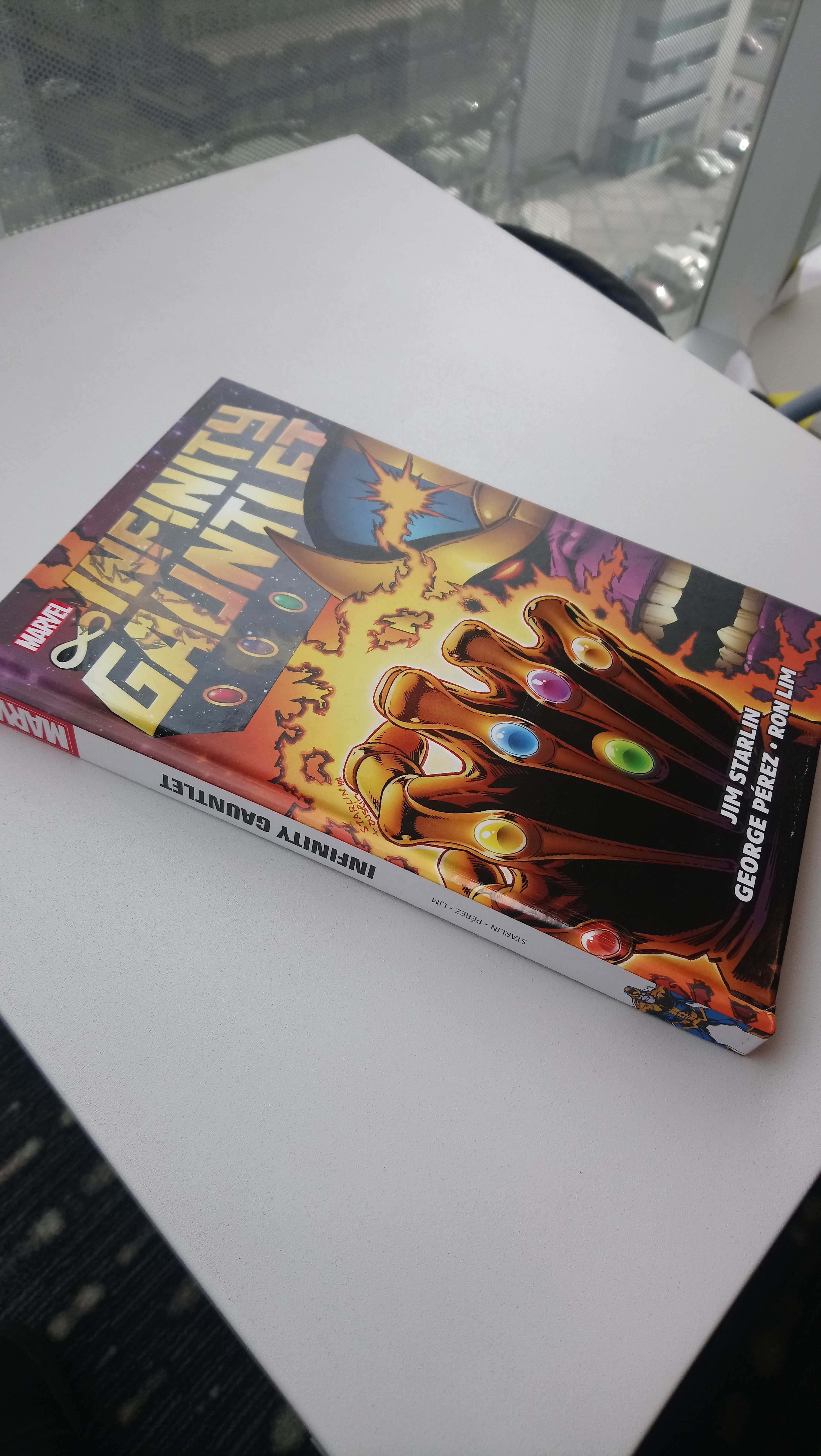 La portada tiene un lacado localizado, lo que le otorga distintas texturas —brillantes u opacas— dependiendo si es el título o parte de la figura del guantelete y, siendo honestos, es todo un encanto ver que mantuvieran el título norteamericano de Infinity Gauntlet y no Guantelete del Infinito. Sí molesta que el texto y los detalles del lomo están a la española. Los textos del lomo deberían leerse de izquierda a derecha, no al revés. Esto provoca que cuando el libro se pone boca arriba en cualquier superficie, el lomo quede con el texto invertido.
