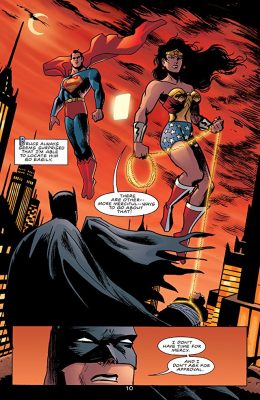 Trinity establece de antemano que el cruzado encapotado y el hombre del mañana se conocen desde antes sin tener una relación hostil. Este último punto es interesante dado que con la caústica personalidad con la cual es plasmado Batman, lo esperable es que chocara constantemente con el Hombre de Acero, pero en realidad sus mayores conflictos durante este tomo son con Diana. En general se hace un buen trabajo plasmando en un plano amplio las virtudes y defectos de cada uno de los protagonistas.