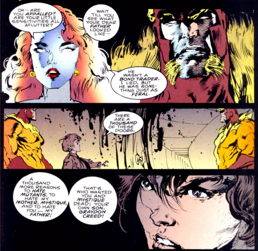 En el dibujo de Circulo Vicioso están Javier Saltares y Mark Texeira, y fue este último el que me entusiasmo en reseñar el tomo, gracias a su trabajo junto a Larry Hama en la miniserie Sabretooth: DeathHunt. Muy a mi pesar Texeira está acreditado como “finisher” siendo Saltares el encargado de la distribución y creación base de las viñetas. Texeira posee un estilo muy dinámico y duro en solitario, pero acá está supeditado a la limitada ejecución de Saltares que hace un trabajo aceptable, pero nada extraordinario.