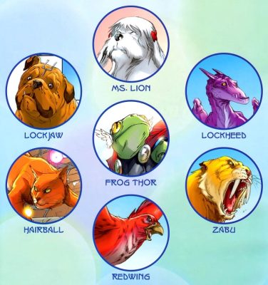 Además del ya nombrado can, los miembros del equipo serían Lockheed, el dragón púrpura de Kitty Pryde; Redwing, el arrogante halcón compañero de Sam Wilson; Hairball, el gato de Speedball; Ms. Lion, el perro de la Tía May, que por alguna razón tiene un nombre de hembra; y Throg, la rana que posee los poderes del Dios del Trueno, y que alguna vez fue conocido como el humano Simon Walterson. Juntos, afrontarán peligros que solo las Mascotas Más Poderosas de la Tierra pueden asumir, en periplos que nos entregaron página tras página de diversión.